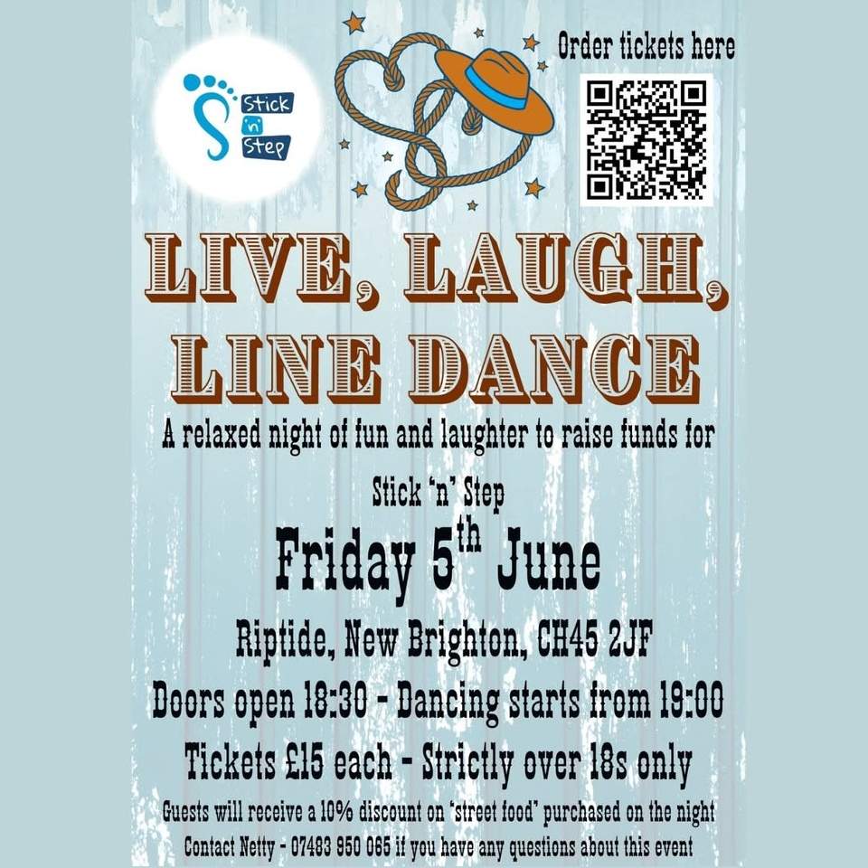 A fun-filled night of line-dancing, games and raffles is coming to Riptide, New Brighton on Friday 5th June, all in aid of Stick ‘n’ Step.